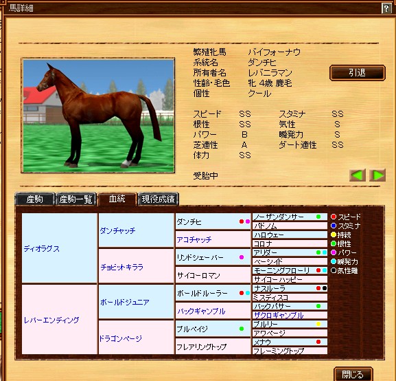 そうそう、1頭わけあって、引退させました。牝4で、これからって 時だったのですがで、パラはこんな感じ↓↓ 持続はたぶんSかと思います できればロベルト系を付けたいなと思ったんですが、いい馬が 成長早いのしかいない為、公開馬でうちの会の持ち馬である、 『ベルフェゴル』を付けてみました!早熟ってのがネックではあります が、中長で、ええとこ走れる馬がほしぃ~なぁ~と